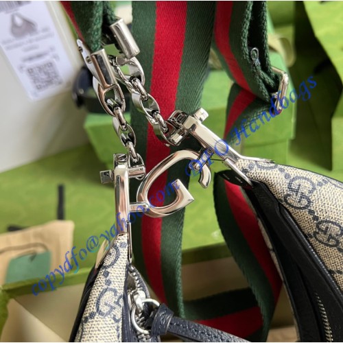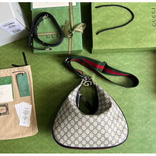 An ode to the timeless Hollywood glamour that shaped Gucci Love Parade, classic elements from the House's archives are reintroduced. Distinguished by its crescent moon shape, the accessory is further defined by a G shaped hook closure. Paired with soft materials, the heritage hardware creates a refined design with vintage appeal. This medium version is crafted from beige and blue GG Supreme canvas, complete with a blue and red Web trim.