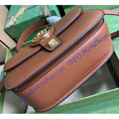 Taking inspiration from the House's archives, a geometrically shaped version of the Round Interlocking G logo sits atop this small top handle bag. The gold-toned hardware adds a defined vintage feel to the style, enriching the design with a timeless feel. The brown leather style is completed by two interchangeable shoulder straps, in tonal leather or gold-toned metal chain.