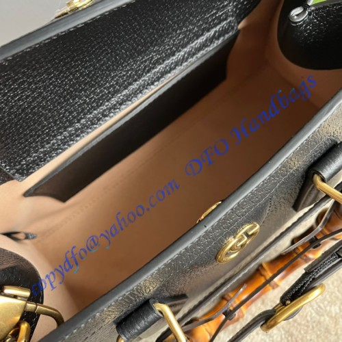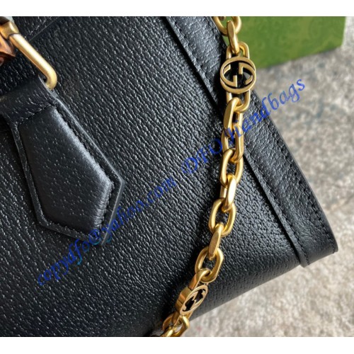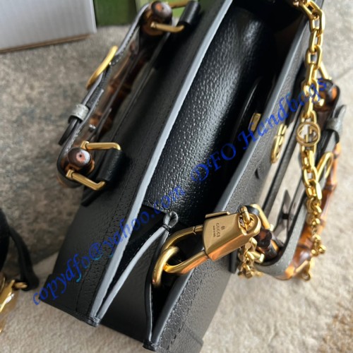 A new shape for Cruise 2023 Gucci Cosmogonie, the Gucci Diana continues to combine recognizable elements of the House with the bamboo handles and Double G hardware. Crafted from black leather, the accessory is further accentuated by two decorative leather belts, a playful reference to the bands used to keep handles in shape.