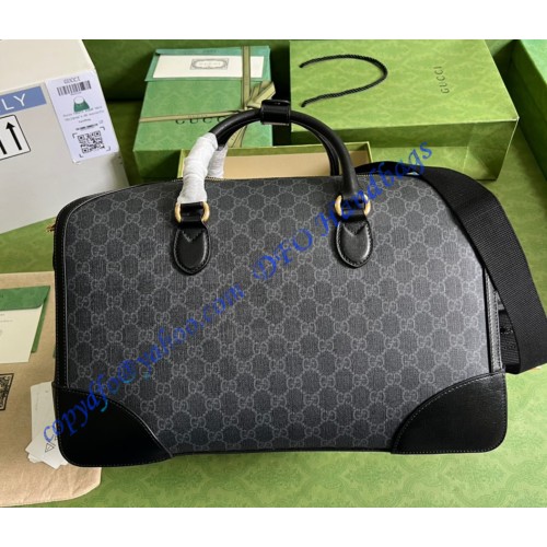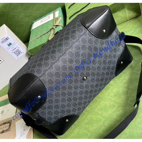 The Interlocking G has remained one of the most symbolic codes of the House since its introduction. The distinguishing emblem appears as a leather detail atop this large vintage-style duffle bag, a subtle reference to Founder Guccio Gucci. Completing the design's logo feel is the black variation of the GG Supreme canvas.