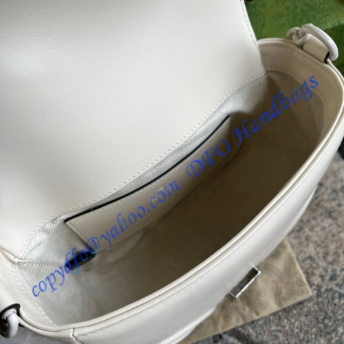 With its recognizable matelassé fabric and Double G hardware, the GG Marmont has become synonymous with the House. Continuously reinvented through the seasons, new shapes are introduced within this signature line, matching Gucci's contemporary vision. Crafted in cream leather, this structured mini shoulder bag is defined by a tonal buckle and chain, exploring rich textures and geometric forms.