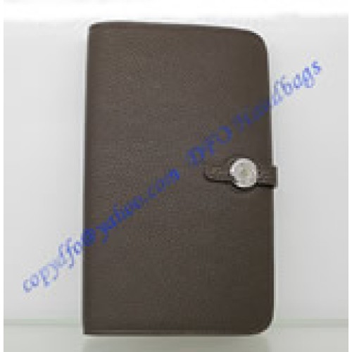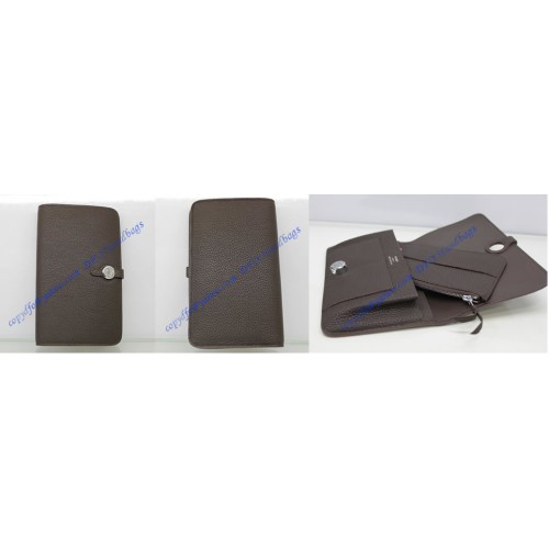 Hermes Dogon Combined Wallet HW508 is made of Togo calfskin. It has a palladium "Clou de Selle" tab and leather strap closure, 1 removable change purse with zipper, 5 credit card slots, 1 banknotes pocket, and 2 additional pockets.