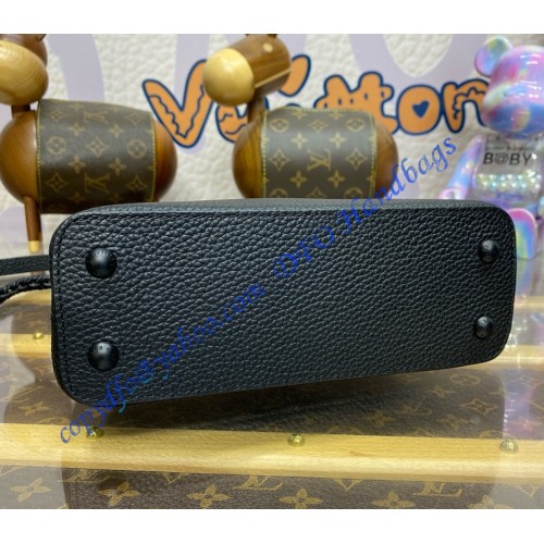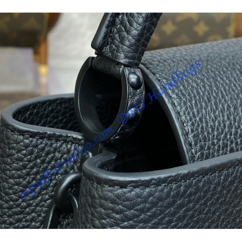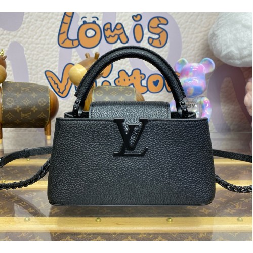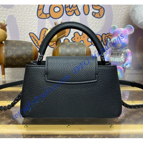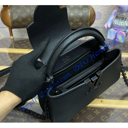 The Capucines Mini handbag is offered in a new east-west silhouette, a fashionable shape sized to hold a smartphone, compact wallet and other small essentials. It is crafted from luxurious Taurillon leather accented with matte hardware, for a modern attitude. Along with all the iconic Capucines signatures, this model features an adjustable braided chain for shoulder or cross-body styling.