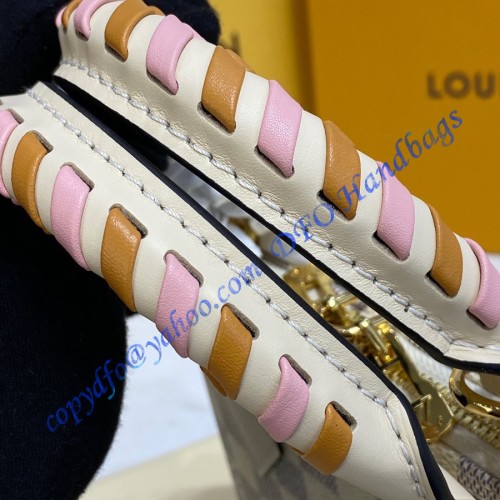 The Alma BB handbag welcomes Spring 2022 in a charming edition made from Damier Azur coated canvas, with leather trim in delicate shades of pink and cream. Two braided Toron top handles lend this model a crafted, feminine allure. The detachable long leather strap provides extra versatility, for over-the-shoulder or cross-body wear.