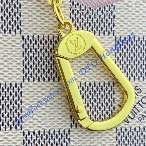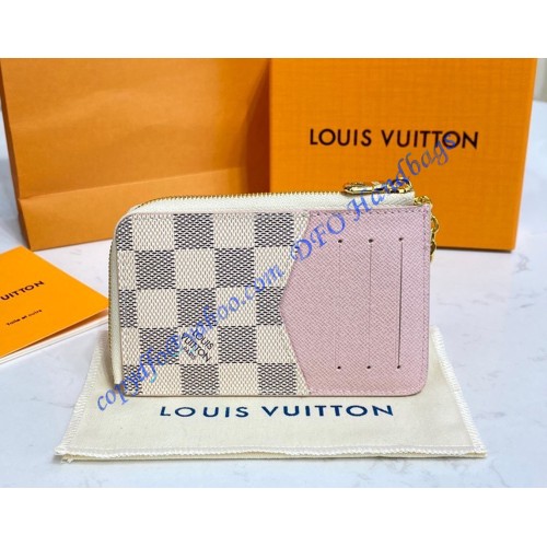 The ingenious Card Holder Recto Verso pairs Damier Azur canvas with colored leather trim. It has a flap pocket with a press-stud at the front, an in-between pocket for folded bills, and a zipped compartment with a wide, L-shaped opening at the back. Three card slots complete this all-in-one accessory, which can be hooked onto a bag or belt.