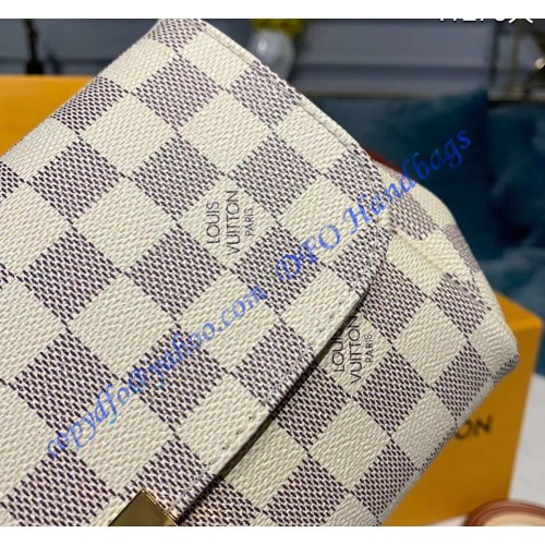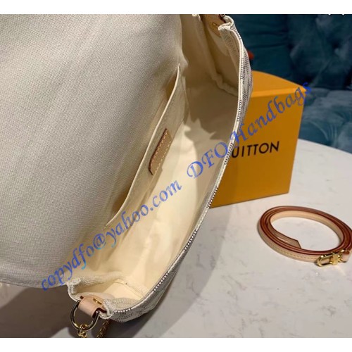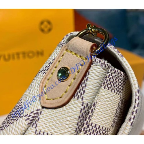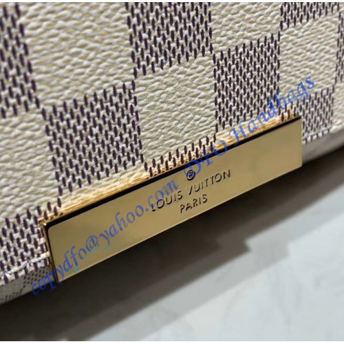 Louis Vuitton Damier Azur Favorite MM, N41275, is made of iconic damier azur canvas with natural cowhide leather trim and textile lining. It has shiny golden brass hardware, a magnetic closure, and a removable leather strap and golden chain. Inside the bag, there is a flat pocket.