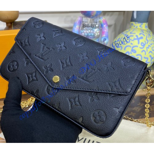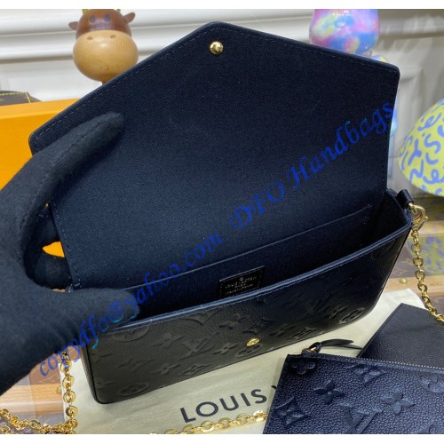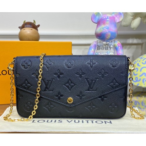 The Félicie Pochette is crafted from Monogram Empreinte leather, embossed with Louis Vuitton's signature Monogram pattern. Designed to adapt to modern lifestyles, this envelope-style pouch contains a spacious compartment with two removable pockets: one zipped, one with card slots. It can also be carried in different ways thanks to a removable chain.