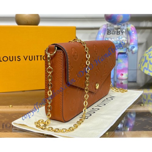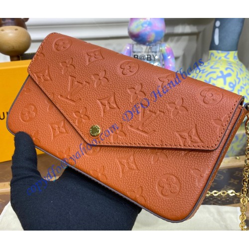 The Félicie Pochette is crafted from Monogram Empreinte leather, embossed with Louis Vuitton's signature Monogram pattern. Designed to adapt to modern lifestyles, this envelope-style pouch contains a spacious compartment with two removable pockets: one zipped, one with card slots. It can also be carried in different ways thanks to a removable chain.