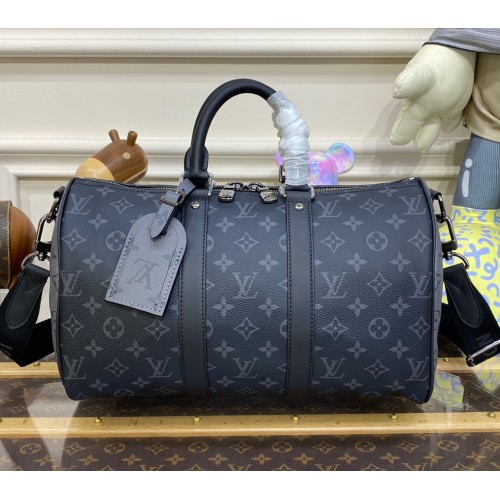 Monogram Eclipse Reverse coated canvas brings understated sophistication to this Keepall Bandoulière 35 bag. The black leather on the top handles and side bands, and palladium-color hardware, emphasize the bag’s timeless design. The strap is detachable and adjustable and enables comfortable shoulder carry.