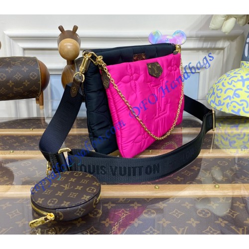 Crafted from recycled nylon in black and rose, the Maxi Multi-Pochette Accessoires belongs to the season’s LV Pillow capsule. This playful piece provides so many styling opportunities: it can be worn cross-body on the long removable strap, carried as a clutch or by hand on its removable chain, with or without the cute detachable coin purse.
