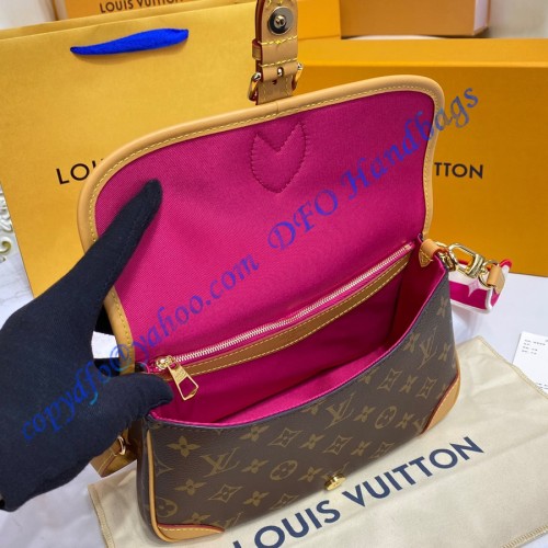 The Diane satchel in Monogram canvas revisits a classic model from the 90s, combining such vintage details as leather corners and an archival-inspired buckle with the modern functionality of smart pockets and a well-organized interior. The exclusive wide jacquard strap reverses from a bold Louis Vuitton signature to a subtle Monogram Flower motif.