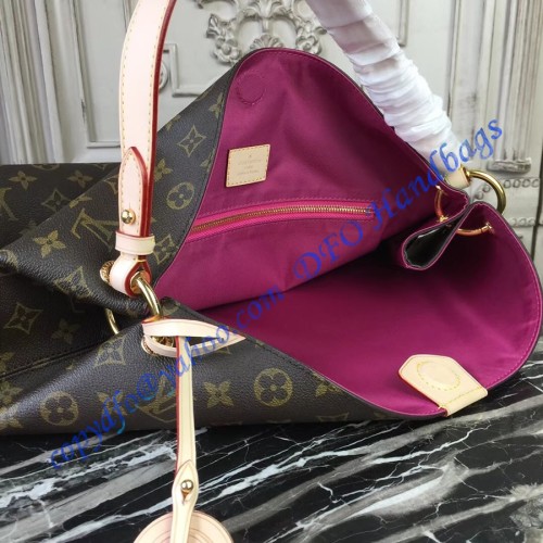 The Louis Vuitton Monogram Canvas Graceful MM Pivoine M43703 is made of coated canvas and it has a Louis Vuitton Paris signature. So far so good. An interesting fact is that the inside of the bag is even better. It comes coated with cotton in pivoine color, so it is sexy and elegant. In addition, cotton lining makes the bag feel so much better and more pleasant to touch.