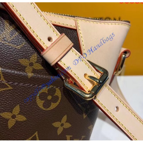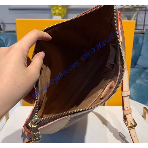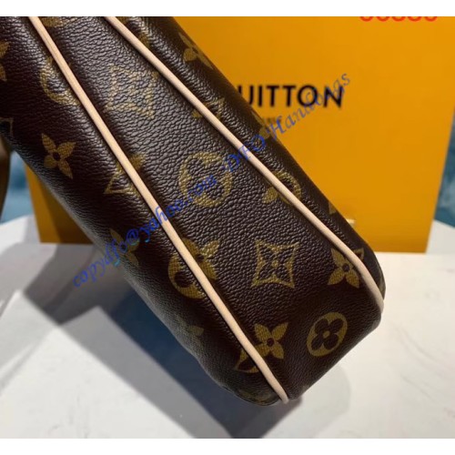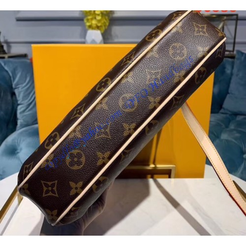 It is made of monogram canvas with natural oxidizing cowhide trim which turns to honey color over time. It has golden hardware, an adjustable shoulder strap, and a top zip closure. Inside the bag, there is textile lining and a patch pocket. It comes with serial and model numbers, a dust bag, a care booklet, and cards.