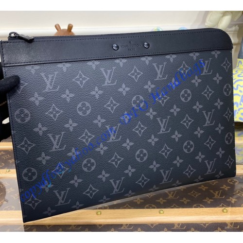 Roomy enough for a laptop, the Pochette Jour portfolio pouch is fashioned from Monogram Eclipse canvas with black-leather trim and black-color hardware. The L-zip opening gives easy access to belongings. The Pochette Jour can be carried as a clutch or used inside a larger bag.