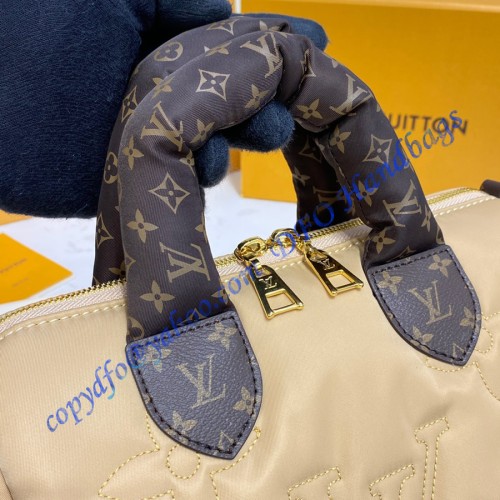The LV Pillow Speedy Bandoulière 25 handbag brings a cool new attitude to one of the Maison’s most iconic designs. Made from padded recycled nylon with a matte tan finish silver, the bag is embroidered with Monogram motifs and trimmed with mini Monogram canvas. The top handles and strap are padded too for a cozy, pillowy effect.