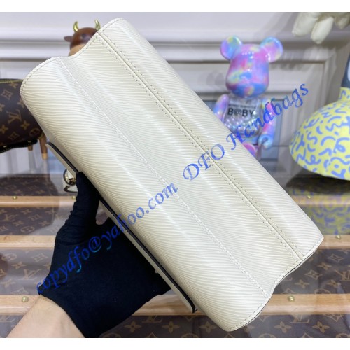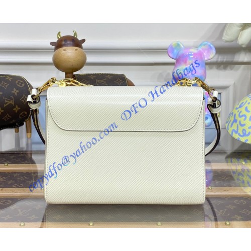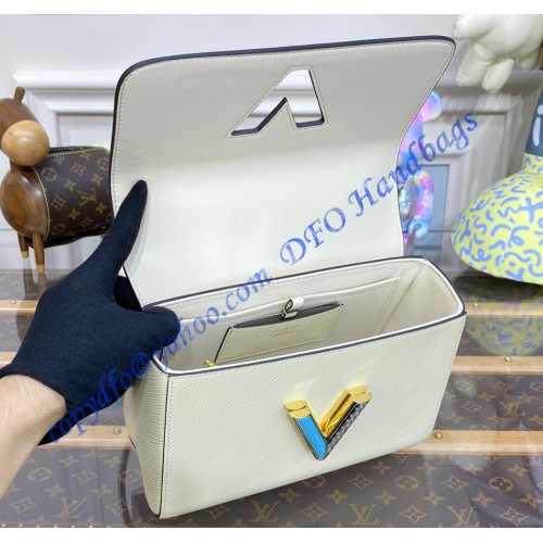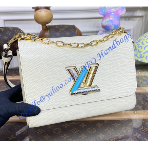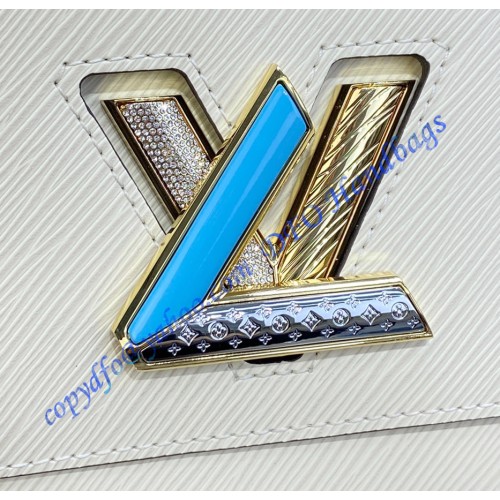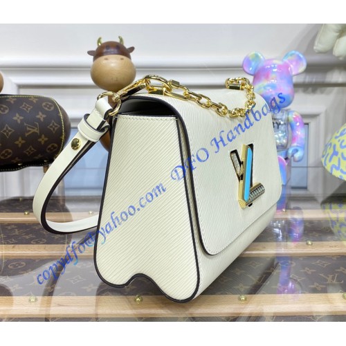 The LV Twist lock on this Twist MM handbag in Epi leather is reinterpreted in a four-part combination of colorful strass, enamel, Monogram engraving, and an engraving recalling the embossing on the Epi leather. A delicate faceted gold-color chain completes the revamp of this classic House bag.