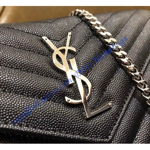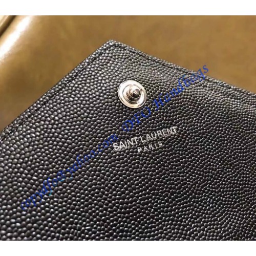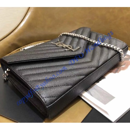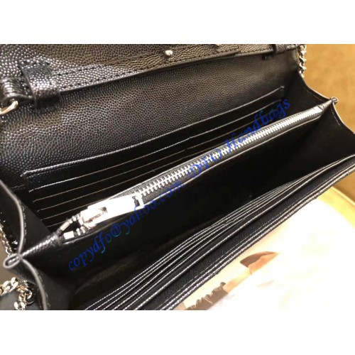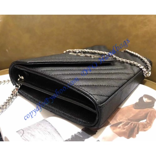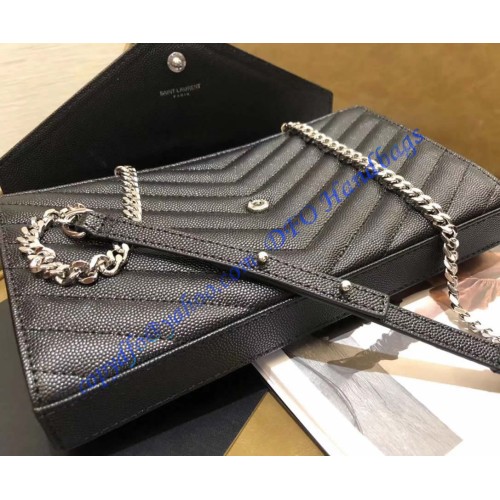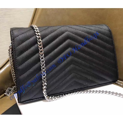 Monogram Saint Laurent Chain Wallet in Black Grain de Poudre Textured Matelasse Leather with Silver-metal Toned Hardware