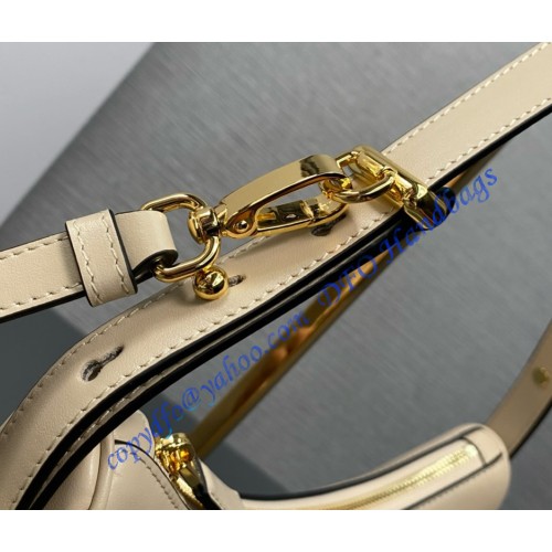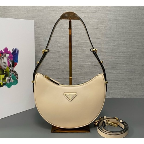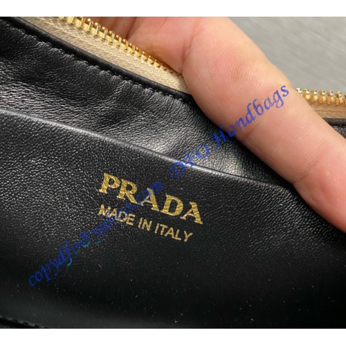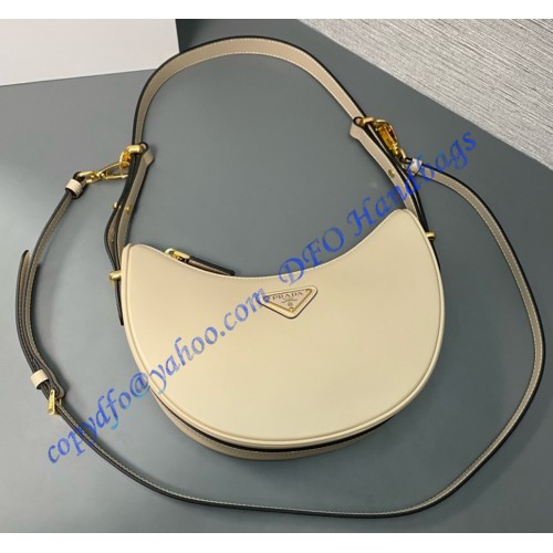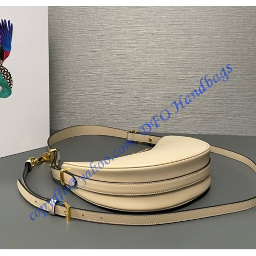 This sleek leather bag expresses versatile, modernist allure. The accessory with a curvy silhouette is completed by the leather extension for versatile wear. With a nappa leather lining and metal hardware, the bag is accented with the iconic enameled metal triangle logo on the front.