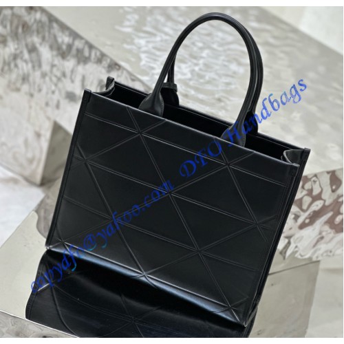 This leather handbag with a sleek, elegant design features a double handle and an internal leather keychain. The accessory infused with contemporary allure is characterized by the stitched motif that echoes the iconic geometric shape of the brand. The metal lettering logo decorates the front of the bag.