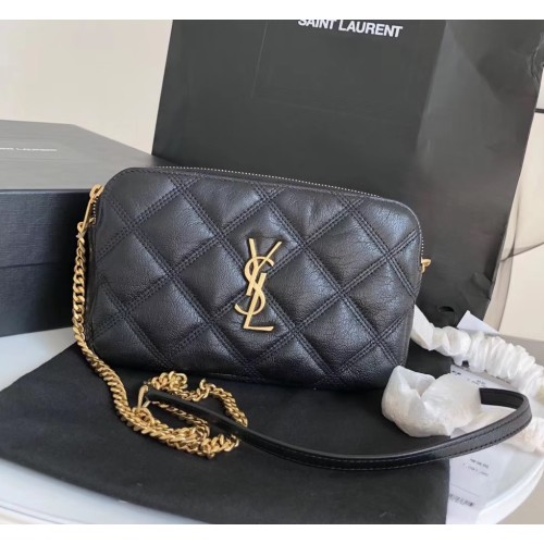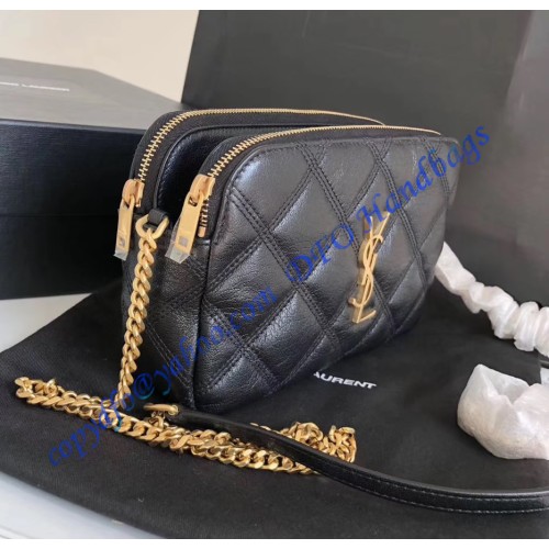 Quilted double-zip pouch decorated with metal YSL initials, featuring a chain and leather shoulder strap.