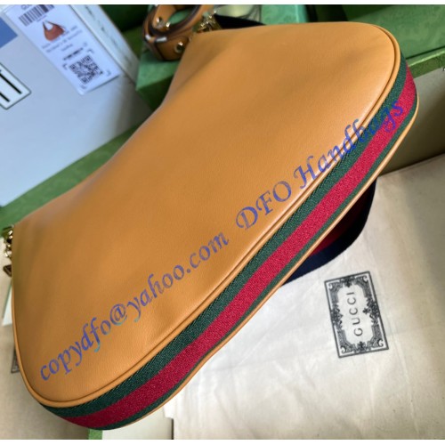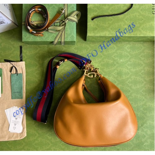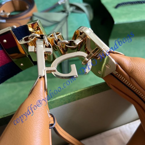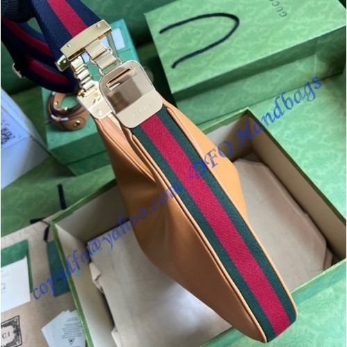 An ode to the timeless Hollywood glamour that shaped Gucci Love Parade, classic elements from the House's archives are reintroduced. Distinguished by its crescent moon shape, the accessory is further defined by a G shaped hook closure. Paired with soft materials, the heritage hardware creates a refined design with vintage appeal. This medium version is crafted in brown leather with green and red Web trim.