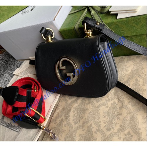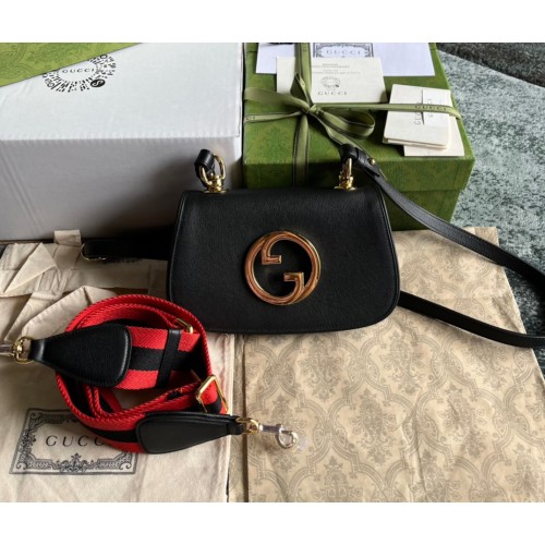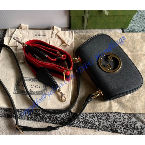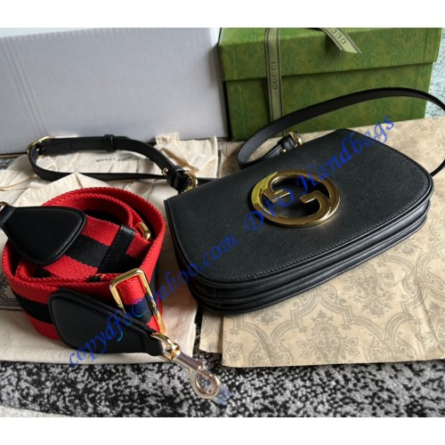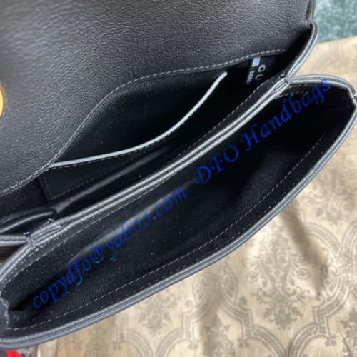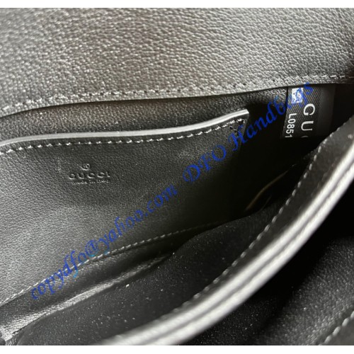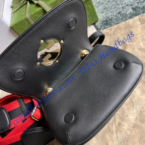 Coming from the House's archives, a geometrically shaped version of the Interlocking G logo is reintroduced for Gucci Love Parade. The gold-toned hardware adds a defined vintage feel to the style, enriching the design with a timeless feel—mirroring the Hollywood glamour that shaped the fashion show. The black leather mini bag is completed by two interchangeable shoulder straps, in tonal leather or the Web stripe.