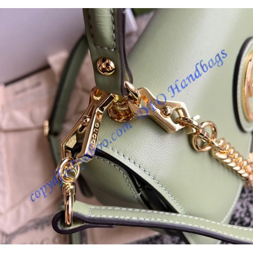 Taking inspiration from the House's archives, a geometrically shaped version of the Round Interlocking G logo sits atop this small top handle bag. The gold-toned hardware adds a defined vintage feel to the style, enriching the design with a timeless feel. The light green leather style is completed by two interchangeable shoulder straps, in tonal leather or gold-toned metal chain.