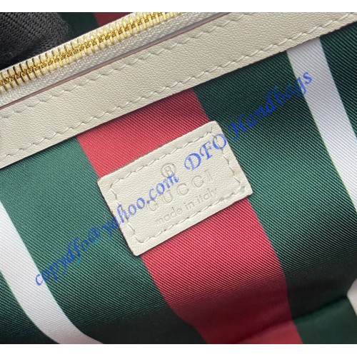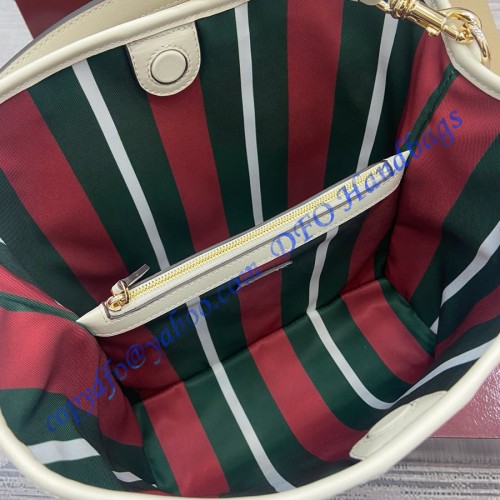 The new GG Emblem collection reinterprets the House’s history of elegance and craftsmanship. This bucket bag highlights a functional design with two main compartments in Web cotton lining and a zip pocket in the middle.