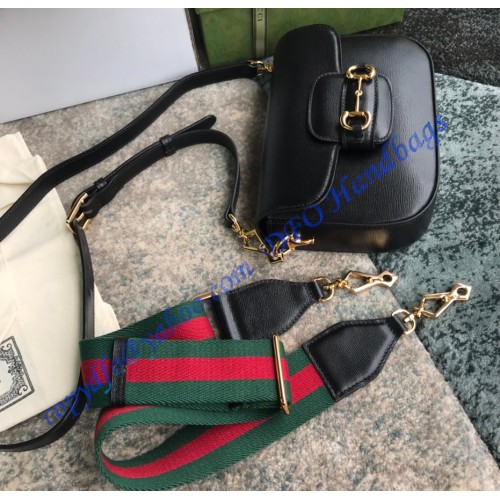 Petite versions of the Gucci Horsebit 1955 add a hybrid twist to the vintage inspired line. Enriched with two different shoulder straps, the black leather mini bag's character transforms from understated elegance with a tonal leather strap to a strong logo feel thanks to a red and green Web option.