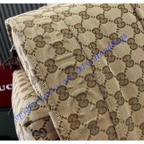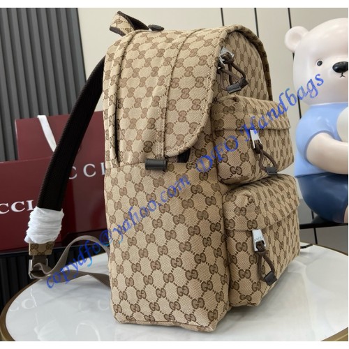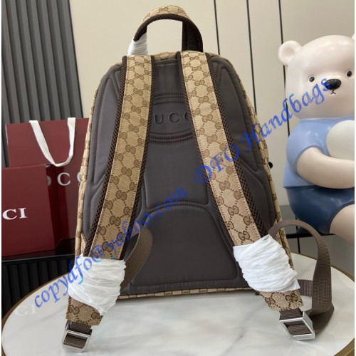Introduced on the men's Fall Winter 2024 runway, the new backpack silhouette blends sleek lines with a sporty attitude. This version in beige and ebony Original GG canvas provides a sophisticated backdrop for the subtle Gucci logo in relief, created with a high frequency embossing technique. Other iconic details include a green and red Web detail on the outside zip pocket.