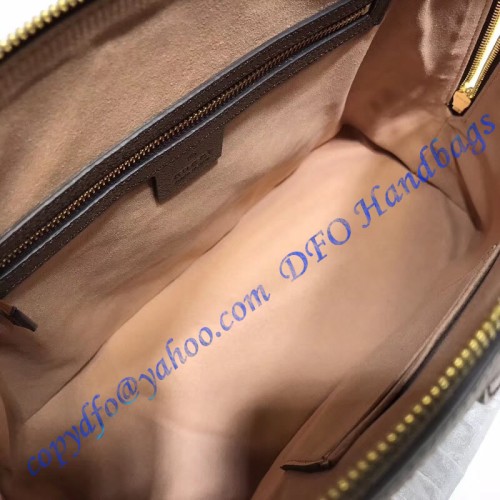 The bag is quite roomy thanks to its domed shape that recalls vintage designs. It has a signature red and green stripe that goes down the center both on the front and on the back of the bag. Furthermore, it has double leather handles with a 3.5” drop and a shoulder strap with a 20” drop. You can carry it without the strap if you feel like it, as it can be detached.