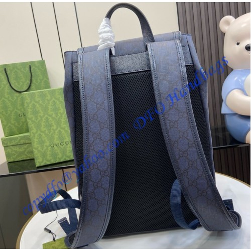 The Ophidia selection of men's bags, including mini cross-body bags, briefcases and totes has been reshaped with functional details. Featuring a GG Supreme canvas construction in timeless color palettes, the Double G motif defines each style as an integral design element. Here it appears on a dark blue backpack.