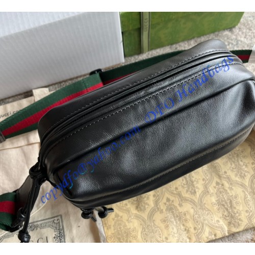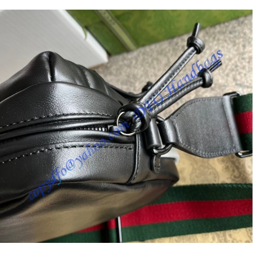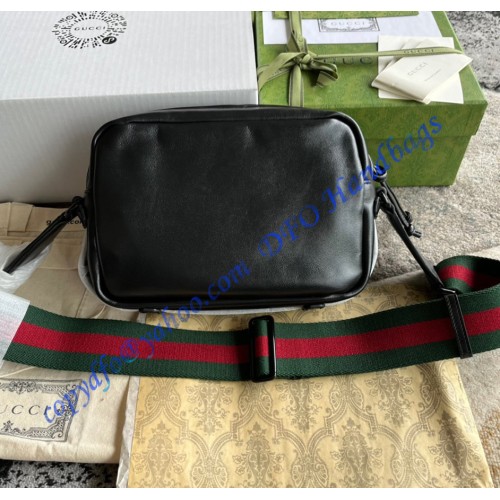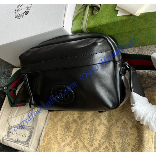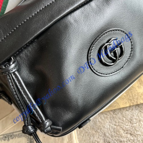 Having appeared in previous collections atop small leather goods, tone-on-tone hardware now enriches the luggage line. The enamel detail offers a softer expression of the emblematic Double G, resulting in an understated travel accessory. Here it defines a black leather shoulder bag with an elegant logo feel.