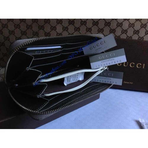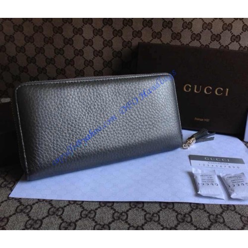This Gucci soho soft patent leather zip around wallet is made of black patent leather with embossed interlocking G. There are a leather tassel, a zip around closure, twelve card slots, three bill compartments and zipper coin pocket.