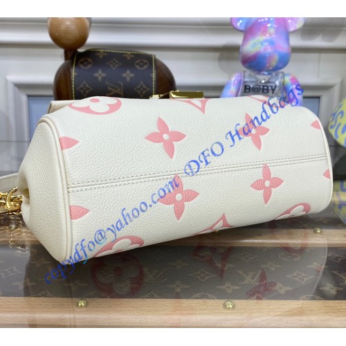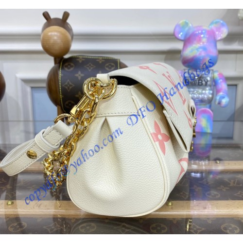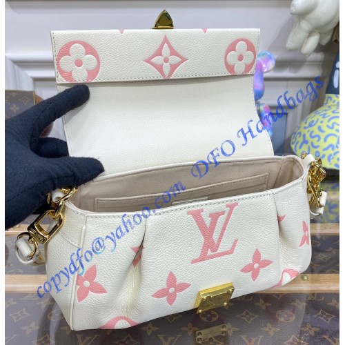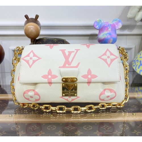 The Favorite handbag is fashioned from embossed Monogram Empreinte leather, with a pink Monogram motif printed on a cream-color background. Lined in a greige-toned microfiber, this baguette shoulder bag has a removable and adjustable leather strap for shoulder or cross-body carry as well as a removable golden chain