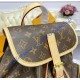 It is made of monogram canvas with natural cowhide trim. It has polished brass pieces, a flap closure, an adjustable textile strap, 2 large zippered front pockets, and a zippered side pocket. Inside the bag, there are textile lining and a D-ring (to attach charms, a pouch or key holder). It comes with a serial number, an authenticity card, a dustbag, a care booklet, and a LV tag.