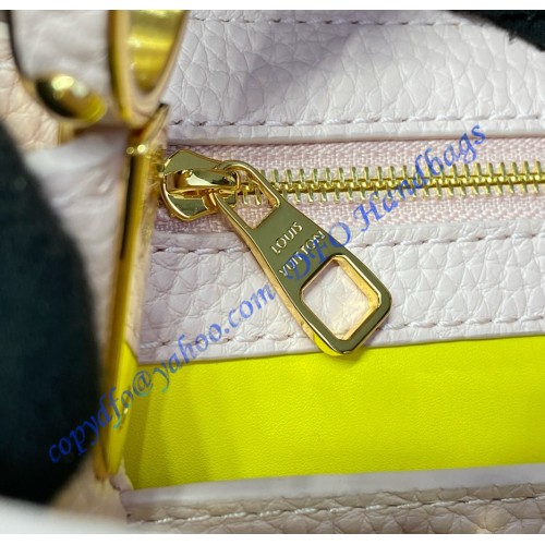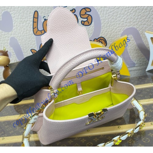 This season’s new Capucines BB Blossom Chain handbag makes an ultra-feminine fashion statement. The exquisite braided chain features golden links interlaced with soft, pastel calfskin, accented with alternating enameled and gold-finish Monogram Flowers. The LV signature is crafted from delicately colored enamel, lending this desirable piece a jewel-like touch.