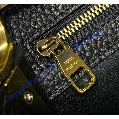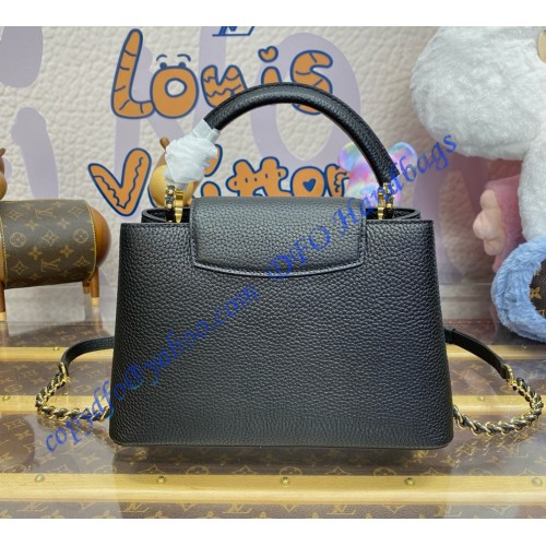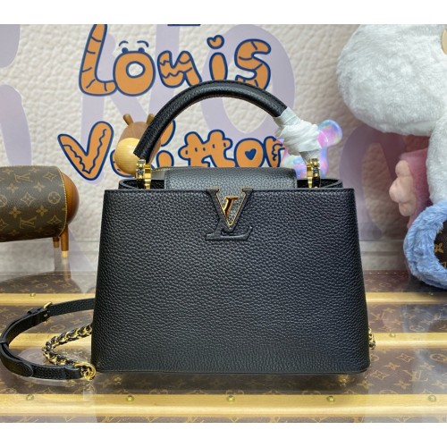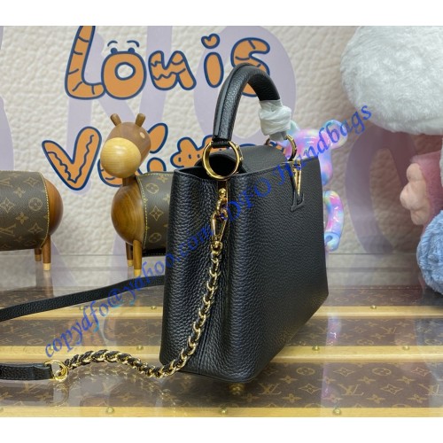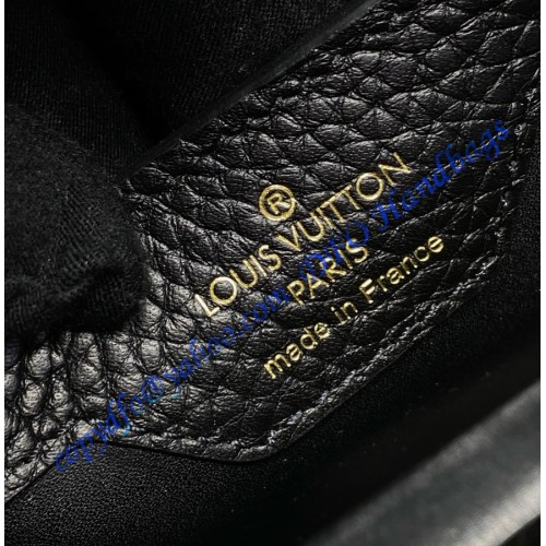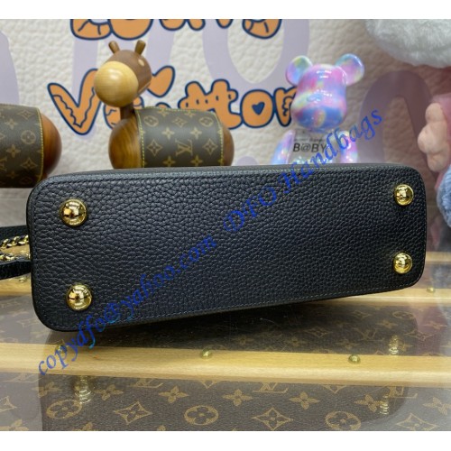 The stylishly Capucines BB handbag looks stunning in Taurillon leather with a crafted gold-color chain braided with leather. The chain is part of a detachable and adjustable strap which allows the bag to be carried on the shoulder or cross-body. The Capucines can be worn with its flap out or tucked inside the bag to feature the iconic LV Initials.