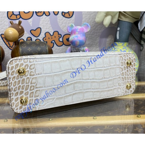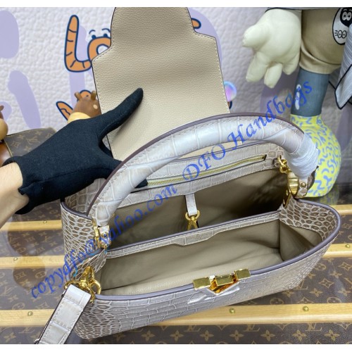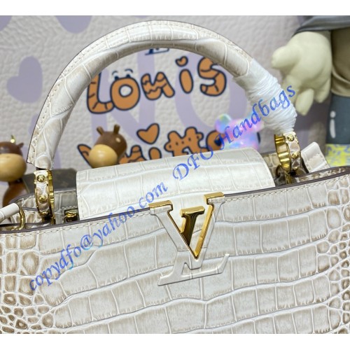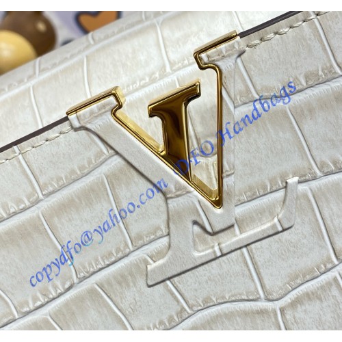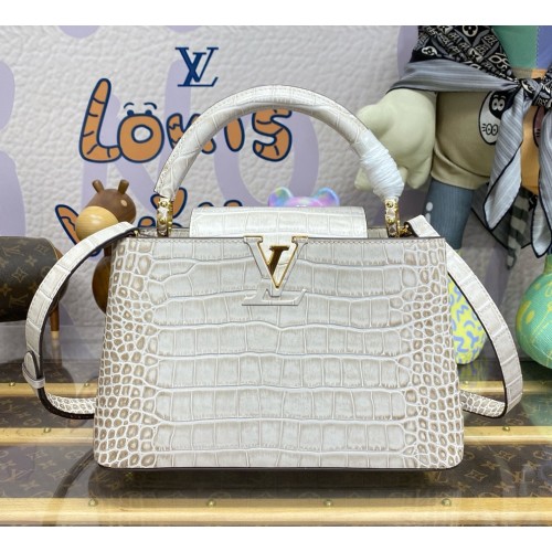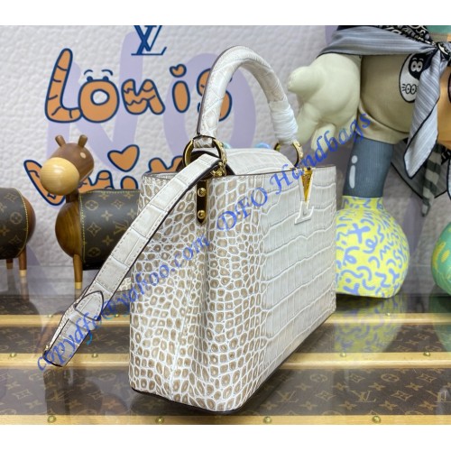 Named for the Rue des Capucines in Paris, where Louis Vuitton opened for business in 1854, the Capucines MM handbag was first introduced in 2013. Superbly crafted from crocodile embossed Taurillon leather, it features a flap which can be worn two ways: outside to reveal a Monogram Flower, or inside to display the leather-wrapped LV Initials. Light enough to carry all day long, by hand, on the shoulder or worn cross-body with the detachable strap.