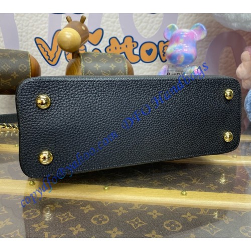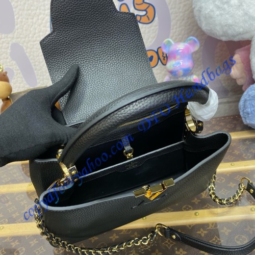 For Spring 2022, the Capucines MM is reinterpreted in Taurillon leather with a seasonal colorway that feels timeless. The bag is complemented by a precious detail anchored in the House’s savoir faire: its practical strap is extended by a gold-color chain with supple leather braided into the metallic links.
