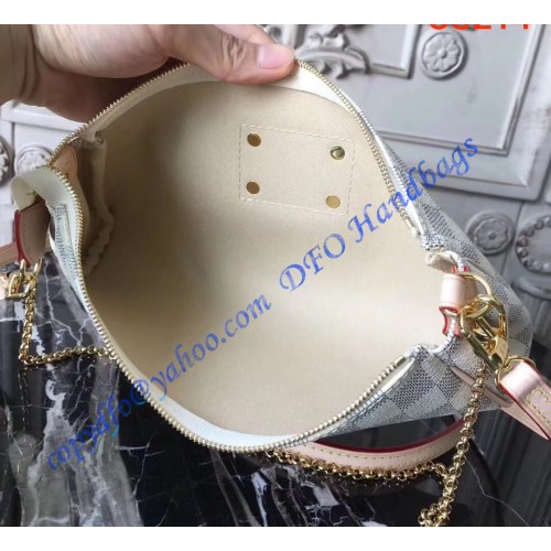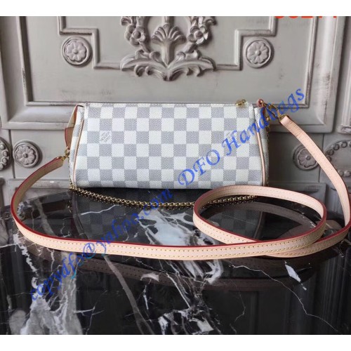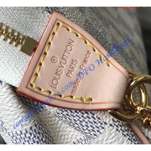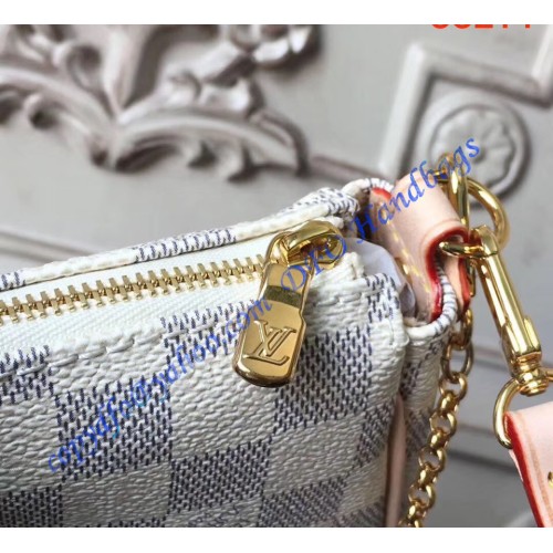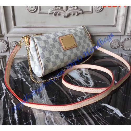 Louis Vuitton Damier Azur Canvas Eva Clutch N55214 is made of damier azur canvas with leather trimmings and textile lining. This bag is ideal for evenings carried as a cluch or on the shoulder. It has golden brass hardware, a secure zipper closure, and a removable leather strap and chain.
