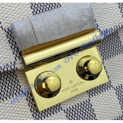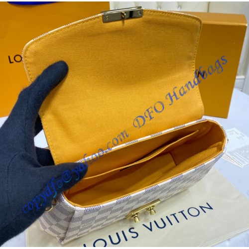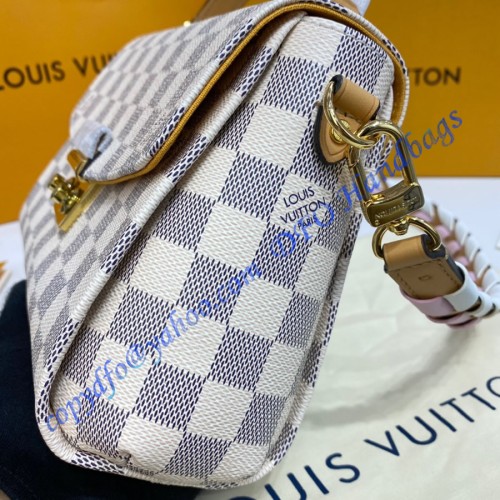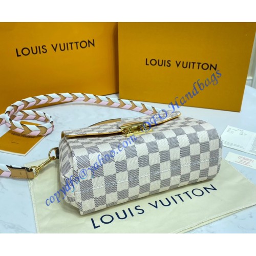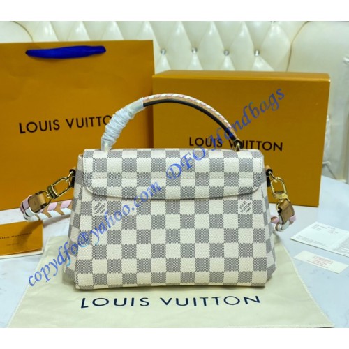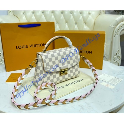 A compact bag with a modern shape, the Croisette hand bag is made from Damier Azur canvas and features a two-tone, hand-braided leather shoulder strap for a summery touch of color. Designed to fit all essentials plus a wallet, this stylish bag can be carried by hand, on the shoulder or crossbody.