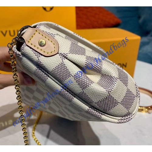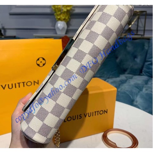 Louis Vuitton Damier Azur Favorite MM, N41275, is made of iconic damier azur canvas with natural cowhide leather trim and textile lining. It has shiny golden brass hardware, a magnetic closure, and a removable leather strap and golden chain. Inside the bag, there is a flat pocket.