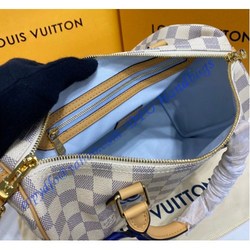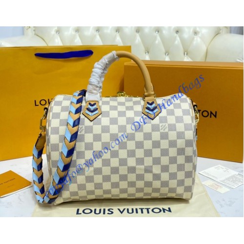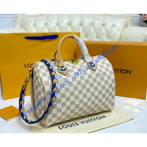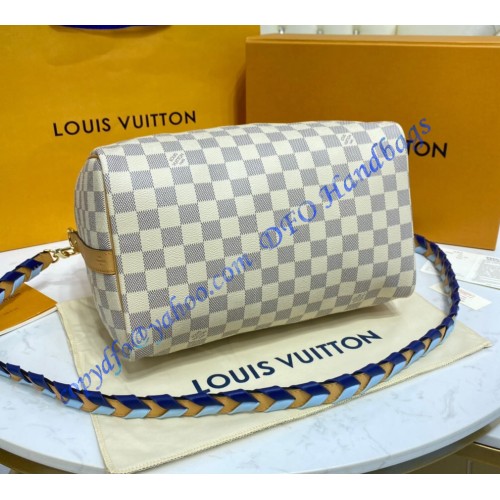 Fashioned from Damier Azur canvas with leather trim, the Speedy 30 Bandoulière features a detachable braided strap in leather. Every lash of leather is braided individually by handmade bringing a colorful and crafted detail. Lightweight and roomy, it’s the perfect everyday companion.