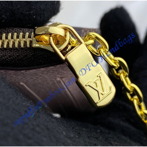 The ingenious Card Holder Recto Verso pairs Damier Ebene canvas with colored leather trim. It has a flap pocket with a press-stud at the front, an in-between pocket for folded bills, and a zipped compartment with a wide, L-shaped opening at the back. Three card slots complete this all-in-one accessory, which can be hooked onto a bag or belt.