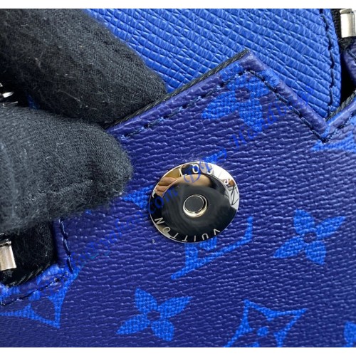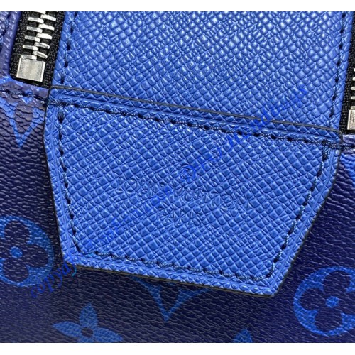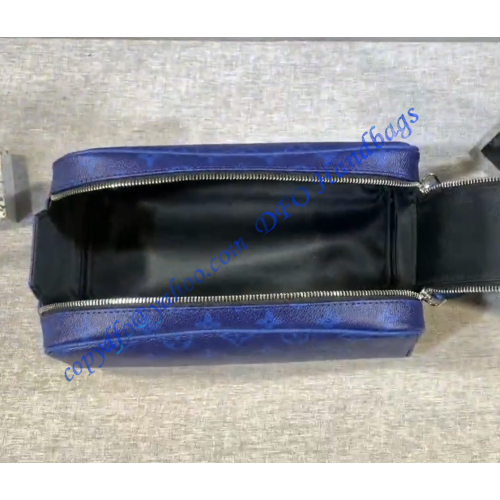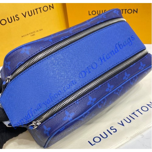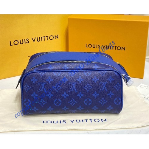 Part of the Taigarama leather goods line, this Dopp Kit toiletry bag is made from Taiga leather and Monogram Pacific canvas, both in a deep blue. The bag’s masculine design includes a double zip opening for quick access to grooming supplies. The wide zip-pull handle cane be used to hang the bag from a bathroom hook.