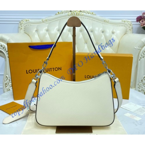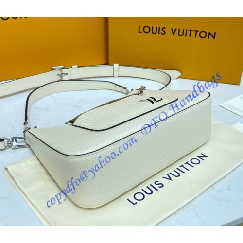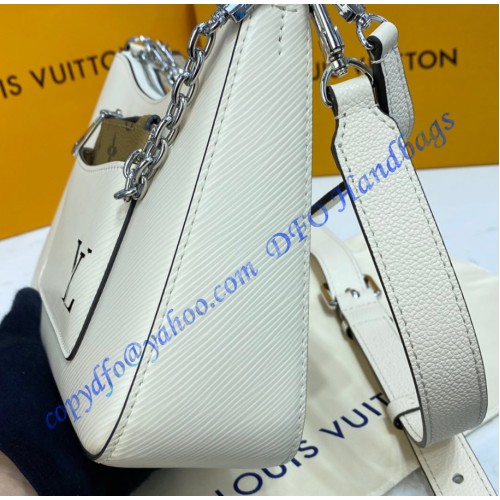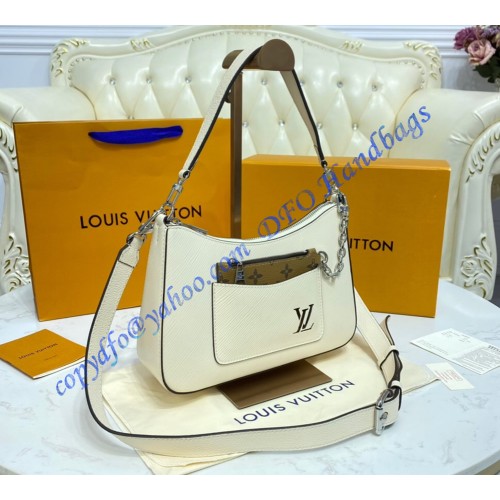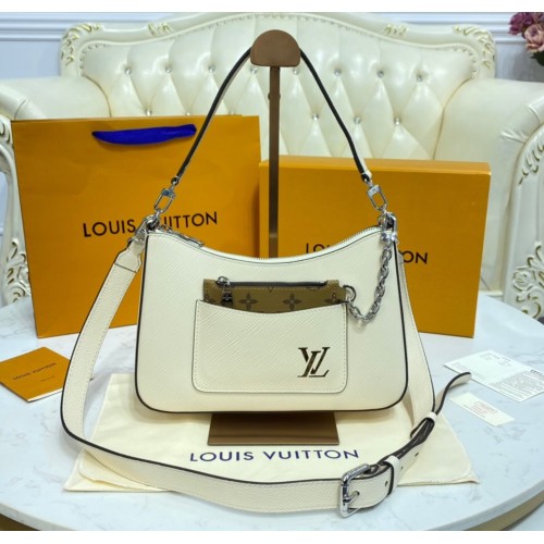 The Marelle handbag is fashioned from grained Epi leather with a detachable canvas pouch that sits in an outside pocket and is attached to the bag with a chain. The Marelle can be carried by hand, elbow or shoulder with its detachable top handle, or worn as a cross-body thanks to its removable and adjustable leather strap.