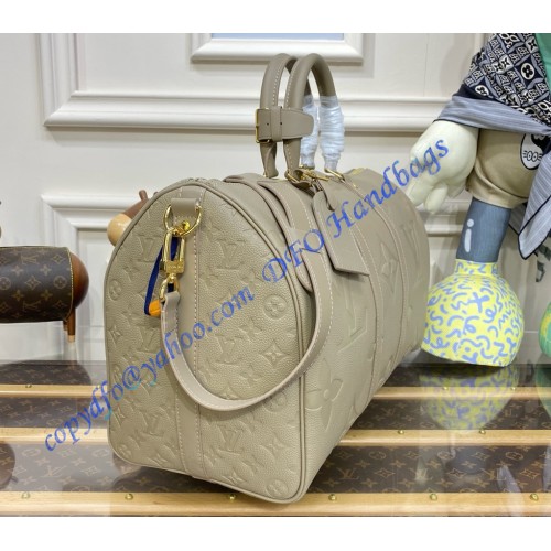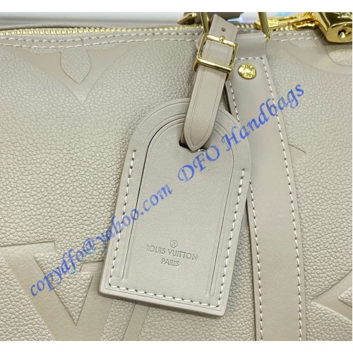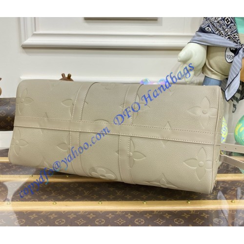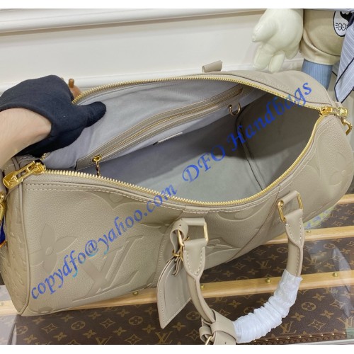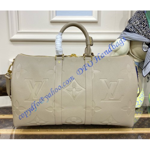 This Keepall Bandoulière 45 is fashioned from Monogram Empreinte Giant leather with gold-color hardware. The supple cowhide is embossed with an oversized Monogram pattern, giving an understated elegance to this classic soft travel bag. Inside, the colored lining brings a graphic feel whilst the zipped pocket makes it functional.