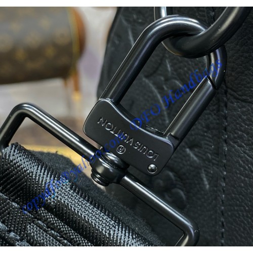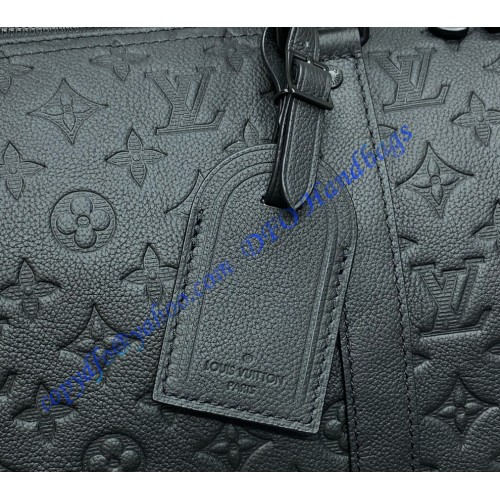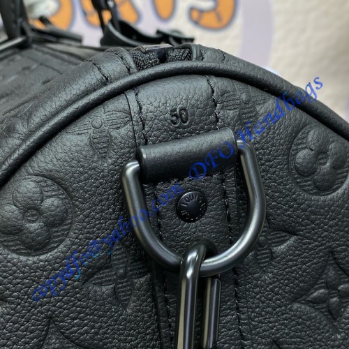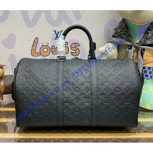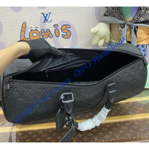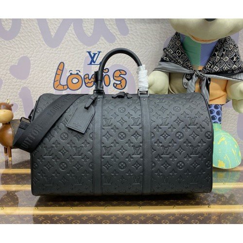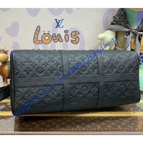 A Louis Vuitton icon, the Keepall Bandoulière 50 is revisited in Monogram Shadow leather, embossed all over with the Monogram pattern. The minimalist design is complemented by matte black hardware. Launched in the 1930s, the Keepall was the original soft travel bag, and it remains as elegant as ever, with the cabin size ideal for short trips.