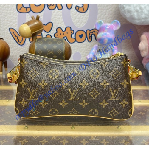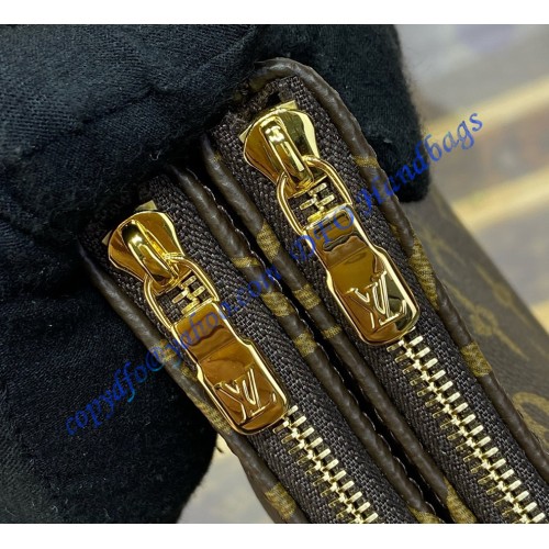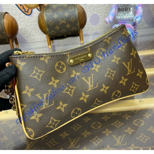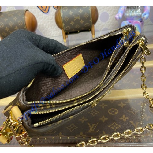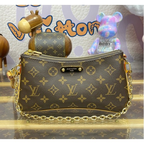 The Liv pochette in Monogram canvas is designed to fit snugly under the arm. It comes with a detachable gold-tone chain and a removable, adjustable double strap in Louis Vuitton's emblematic natural cowhide leather. A secure, double-zip closure and an engraved, gold-tone plaque finish this stylish piece.